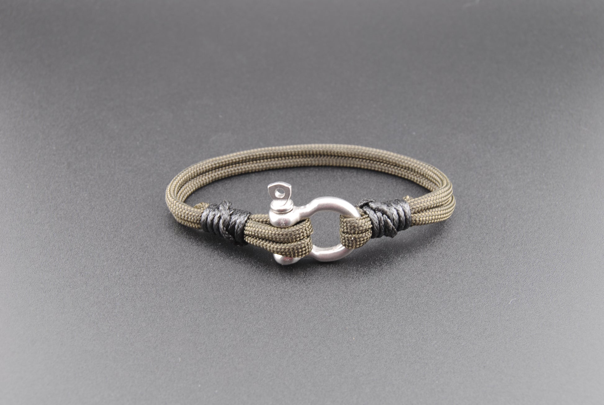Military Green 550 Paracord Bracelet with Black whipping. Stainless Steel D-Shackle Closure.