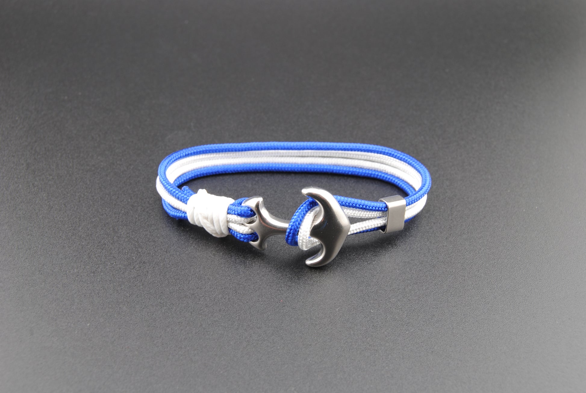 Blue and White 275 Paracord Bracelet with White whipping. Stainless Steel Anchor Clasp with adjustable decorative stainless cinch.