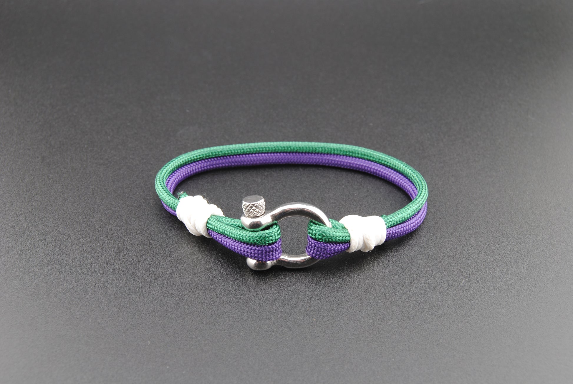 Purple and Green Paracord Bracelet with White whipping. Polished Stainless Steel D-Shackle w/ Crown Closure.